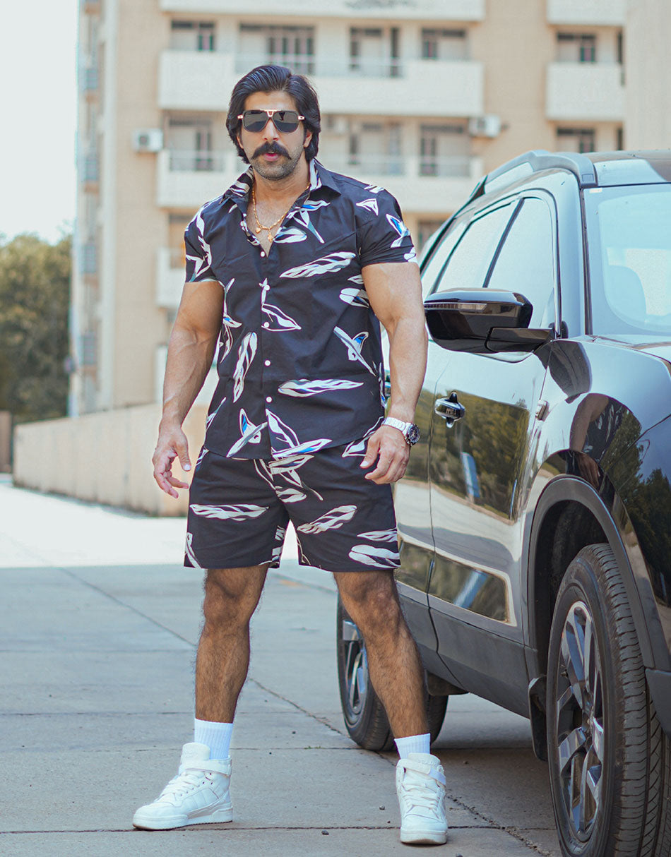 Men's Black Leaf Printed Co Ords Set